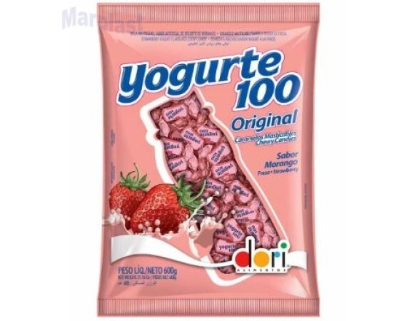 BALA YOGURT100 MORANGO 600G DORI - mastigável sabor iogurte de morango colorida artificialmente.