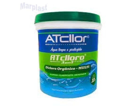 ATclloro 3 em 1 é utilizado em tratamento de águas de piscinas, tendo o poder desinfetante, destruindo os microrganismos. Apresenta 3 funções em um só produto: desinfeta, clarifica e decanta, atingindo o resultado esperado com um prático tratamento, reduz a mão de obra empregada nos tratamentos convencionais. Teor ativo: 36,47%