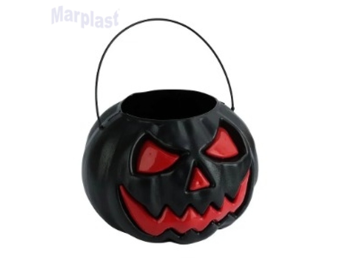Adicione um toque divertido e assustador à sua festa de Halloween com este baldinho de abóbora. Com sua design preto e alça prática, é perfeito para distribuir doces ou usar como decoração temática
