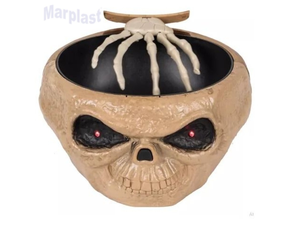 BANDEJA CRÂNIO PEGA DOCES ACIONA COM SENSOR, ACEDE OS OLHOS, EMITE SOM ASSUSTADOR E SAI UMA MÃO PARA PEGAR OS DOCES