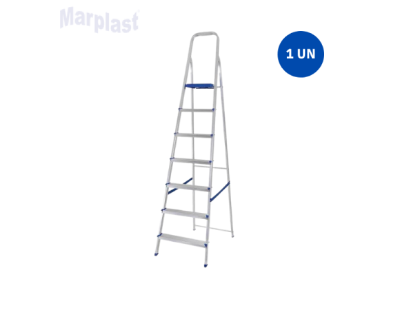 Com capacidade para 120 kg, a Escada de Alumínio 7 Degraus é leve, dobrável e fácil de guardar, perfeita para consertos e manutenção doméstica.